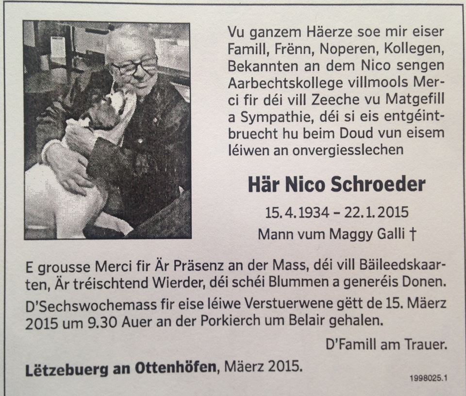 I had the pleasure of meeting Nico in 2012. I was working for the US Army in Germany and took my parents to Luxembourg while they were visiting. As we exited my car at Sandweiler, Nico approached and introduced himself. Hearing Nico’s story meant so much to my father, who joined the US military after watching his own father serve during WWII. Nico was a treasure and I am saddened to hear of his passing. May his memory and smile live long and bring comfort.